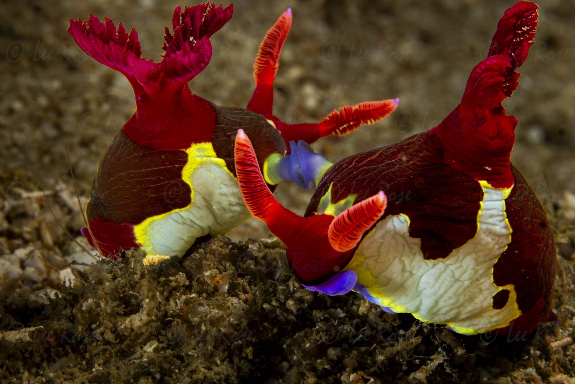 This macro underwater photograph, two vibrant Chamberlain’s Nembrotha nudibranchs are positioned in the foreground, with their bodies close together, suggesting interaction. Their bodies are a rich, dark maroon color, textured with subtle, wavy lines. Contrasting this dark hue is a striking pattern of bright yellow and pale, almost white, flesh-like markings that outline irregular shapes on their sides. The nudibranchs have prominent, bright red, feathery appendages extending from their anterior ends. These structures are highly detailed, showing individual frills and a velvety texture. Further back on their bodies, they have other sensory tentacles, also red and ribbed, which are pointed upwards or outwards. A striking element of their coloration is the presence of vivid purple patches visible around their oral regions, adding another layer of intense color. The overall impression is one of exotic marine life, showcasing the extraordinary colors and forms found in the underwater world. The detail captured allows for an appreciation of the intricate textures and patterns of these fascinating creatures. This image was taken off Puerto Galera on Midanoro in the Philippines.