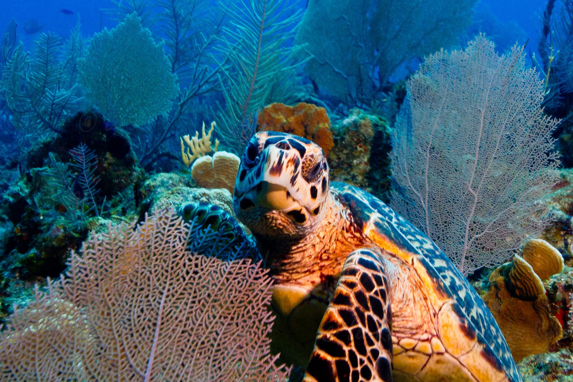Cayman Islands turtle pausing lunch to check out diver overlooking a coral fan in the crystal blue waters of the Caribbean.