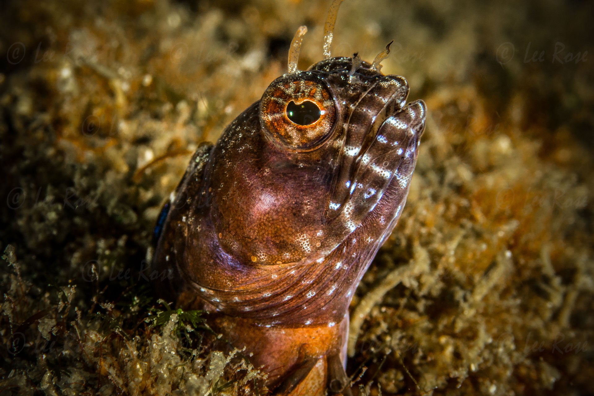 This extraordinary underwater macro image shows a sailfin blenny fish peering out from his burrow in the coral at the Blue heron bridge in Florida.