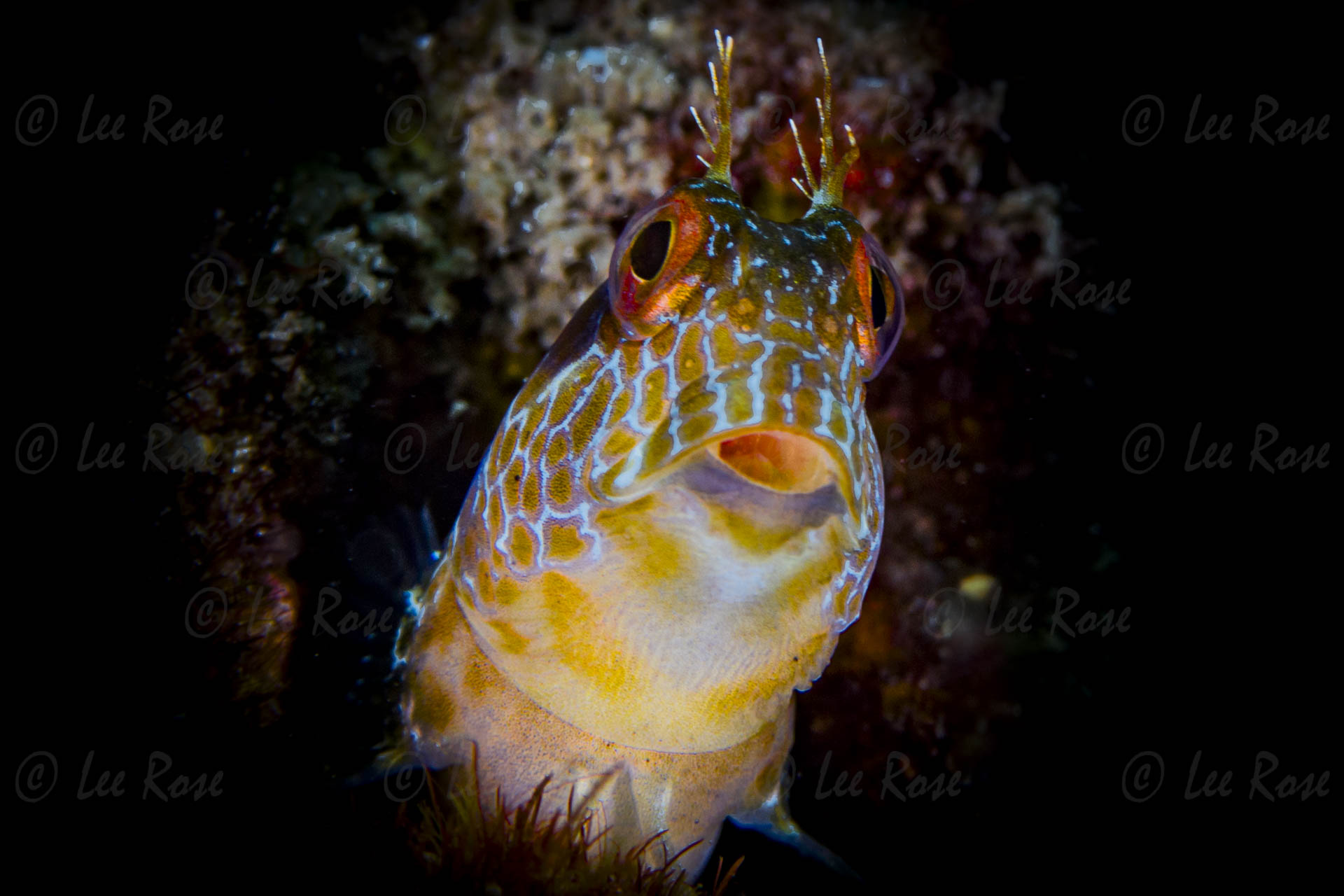 This underwater macro image shows a seaweed blenny fish peering out from his burrow in the coral at the Blue heron bridge in Florida.