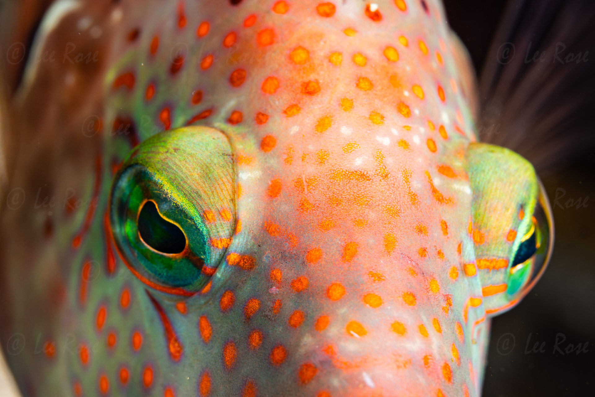 This is an extreme close-up, head-on shot of a Freckled Hawkfish. This guy photo bombed another image I was trying to take by rushing up to my lens. It is a predatory fish species found in Indo-Pacific coral reefs. This species is characterized by the distinct orange or reddish spots covering its head and body. The image was taken off Anilao near Batangas Philippines.