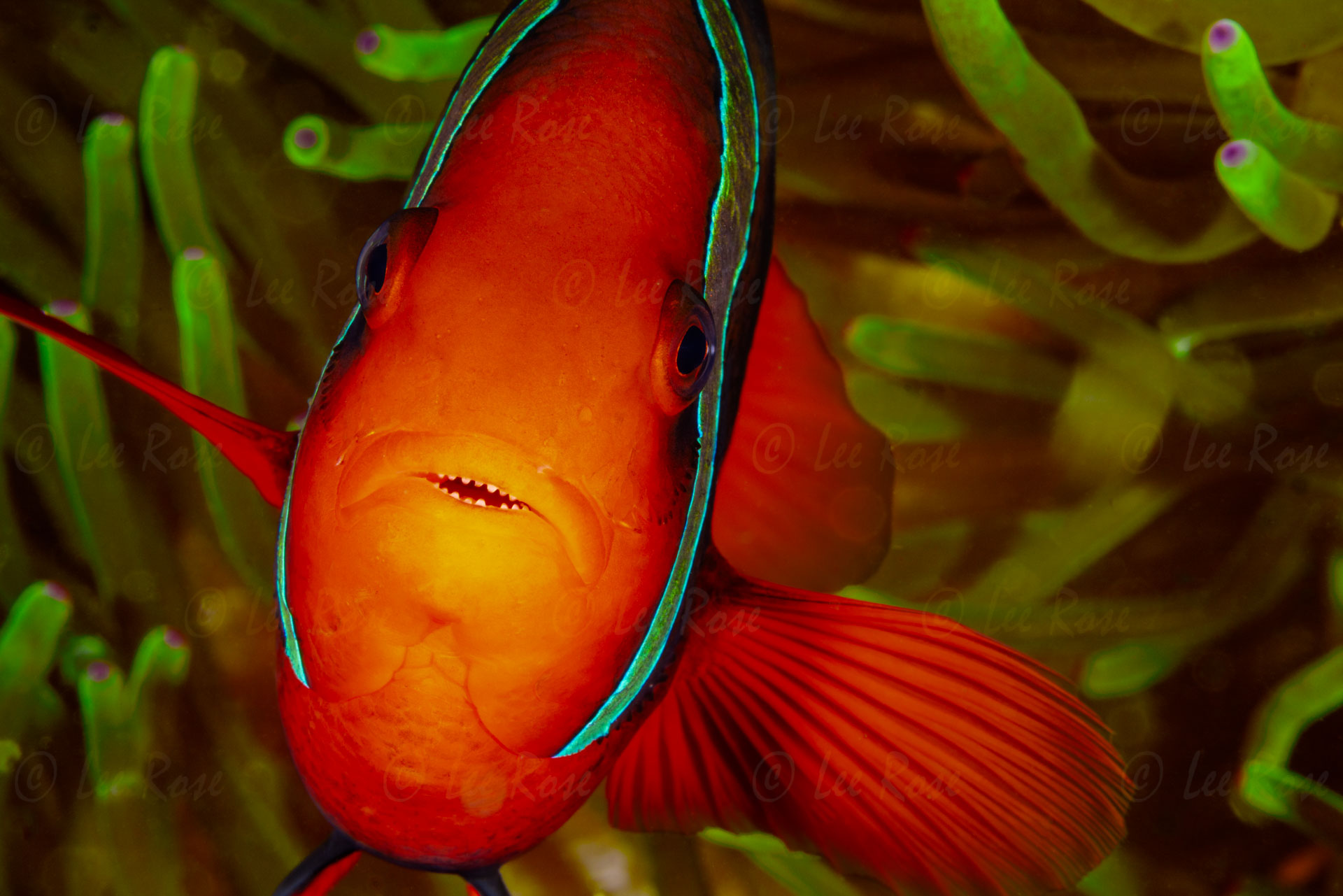 This is a close-up, head-on shot of an anemonefish, also known as a clownfish, set against his home of green sea anemone tentacles. This species is known as a tomato clownfish. Its vibrant orange body. Subtle variations in the orange hue are visible, with a warm yellow undertone on its belly and face that deepens to a richer, more saturated orange on its flanks and fins. Two distinct vertical stripes, or bands, are present on the fish. The one near the front of its head is a thin, dark line, followed by a striking, bright turquoise blue stripe that edges the top of its head and extends down its body, bordered by a thin black line. Clownfish are very territorial and this one came out to rush the camera, hence the extreme close up. The image was taken off Anilao near Batangas Philippines.